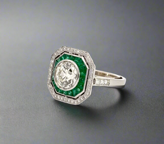 Anillo de platino con piedra preciosa esmeralda y diamante talla mina antigua de 1,25 quilates