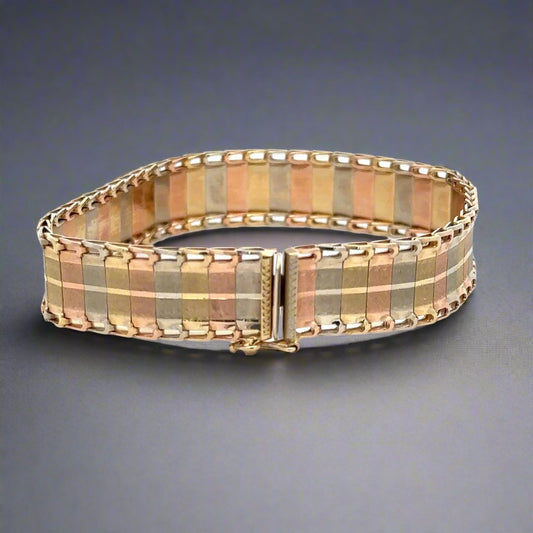 14K Tri Color Rose, Yellow, + White Gold Ladies Flat Bracelet