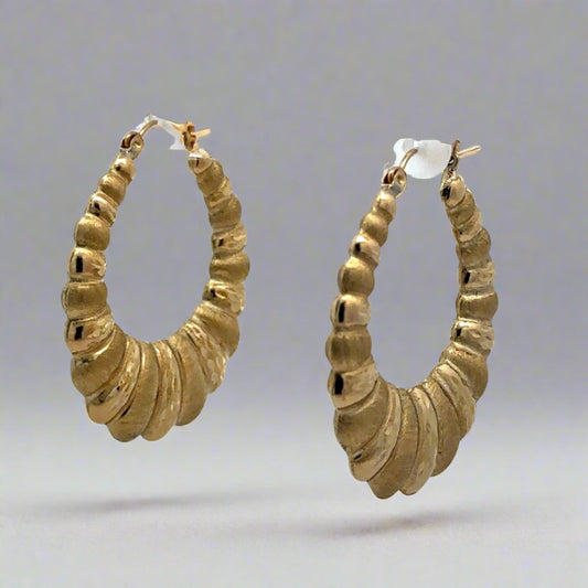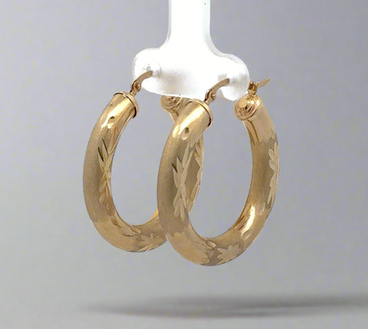 10K Yellow Gold Brushed + Polished Leaf Embossed Hoop Earrings