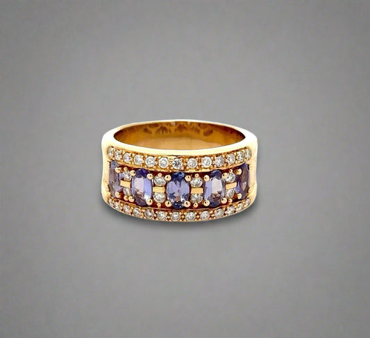 Anillo de oro amarillo de 14 quilates con diamantes y piedras preciosas moradas para mujer