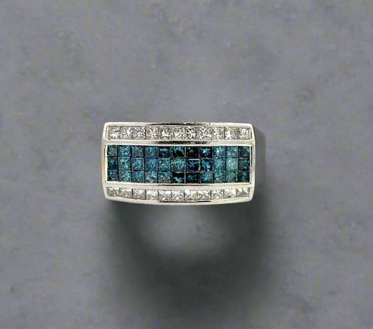 Anillo de moda para hombre de oro blanco de 14 quilates con diamantes de talla princesa azul y blanco