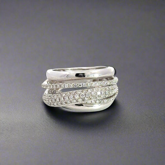 Anillo de banda de oro blanco de 14 quilates con diamantes pavimentados entrecruzados para mujer