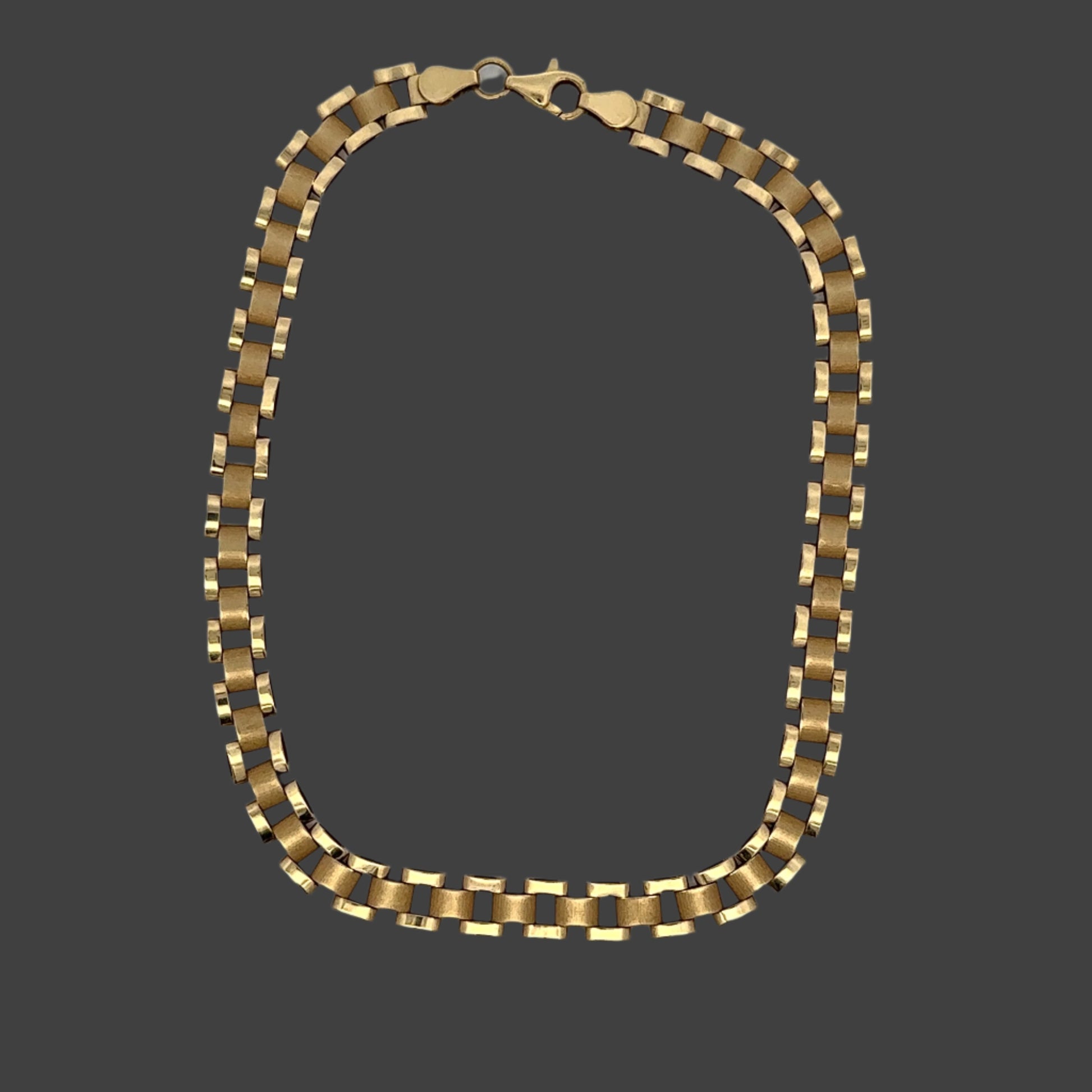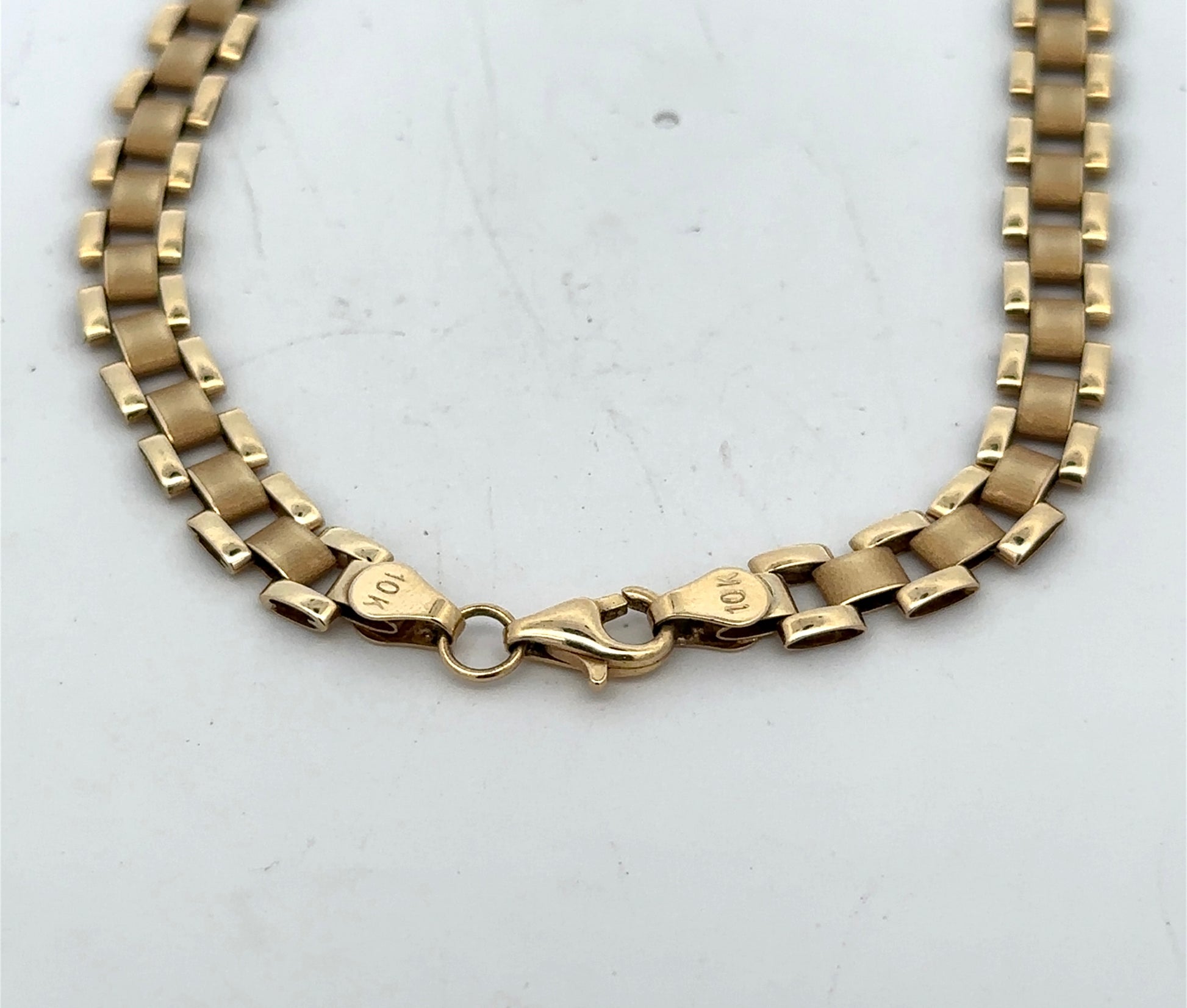 This is a rolex style anklet set in 10K yellow gold. It is 10" long with a 6.2mm thickness. It's in very good condition with faint scratches.