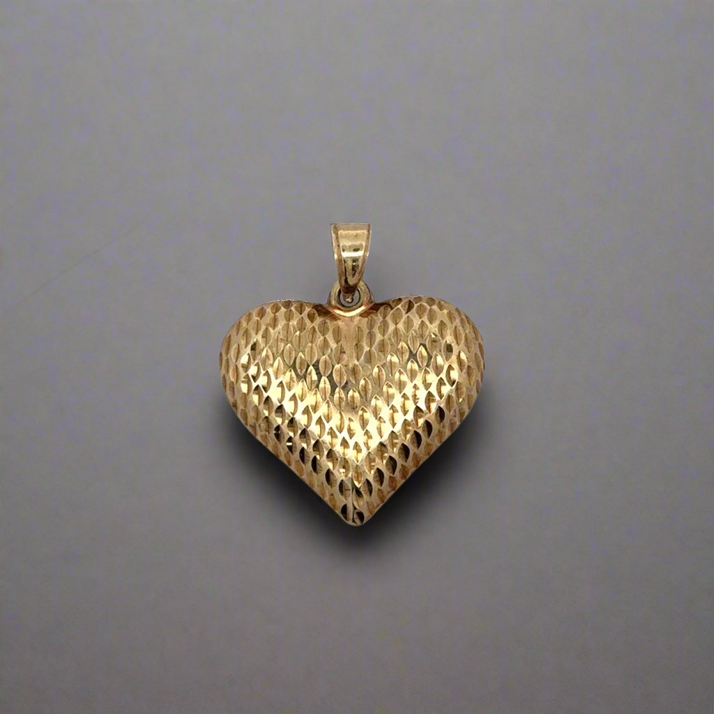 This is a puff heart pendant set in 10K yellow gold. It features a textured design on the front and the back and is hollow in the center. It can be paired with a thin style chain. It is in very good condition and can be worn by people of many ages.
