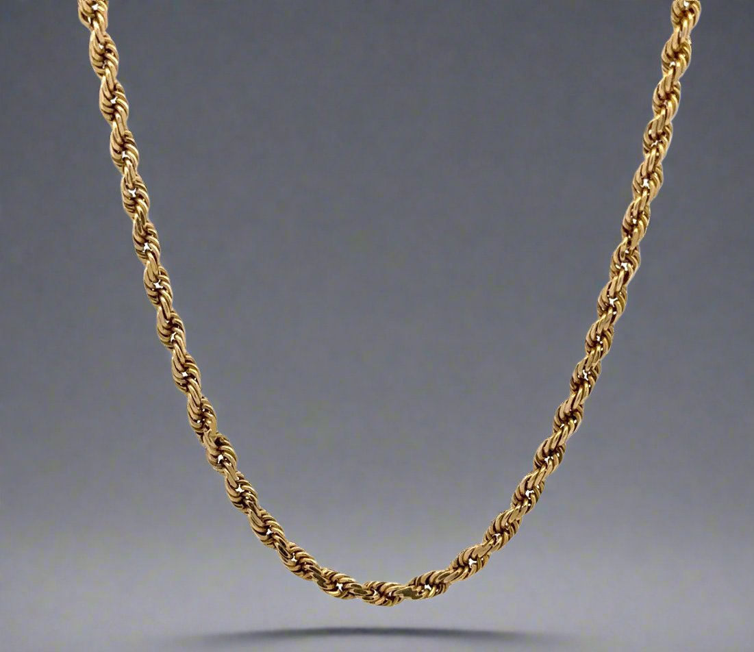 This is a rope style chain set in 14K yellow gold. It is a shorter style chain with a 21.25" length and a 2.8mm thickness. It can be worn by itself, paired with a pendant, or layered with other chains. It's in very good condition.
