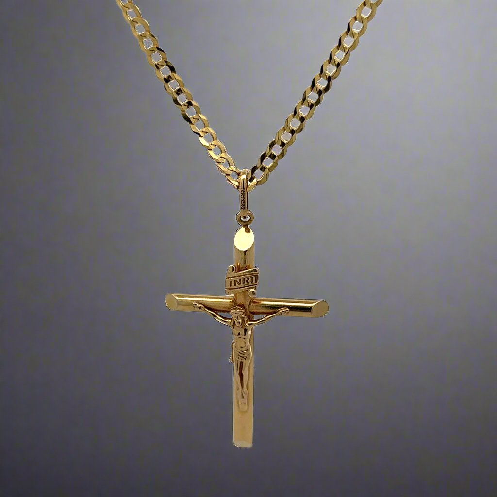 14K Yellow Gold Crucifix + Curb Link Unisex Necklace